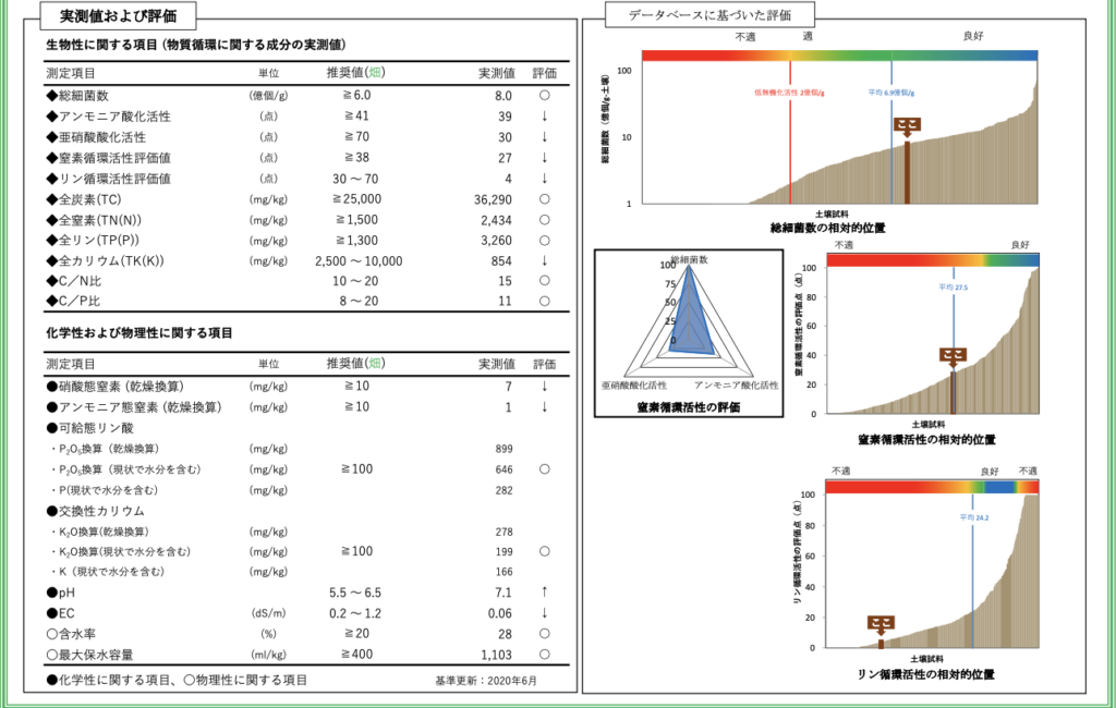 SOFIXでは土の化学性にプラスして生物性(微生物がどれだけいるか)も計測できるのが売りでまず生物性の分析が表記されています。いろいろと小難しいワードがありますが
