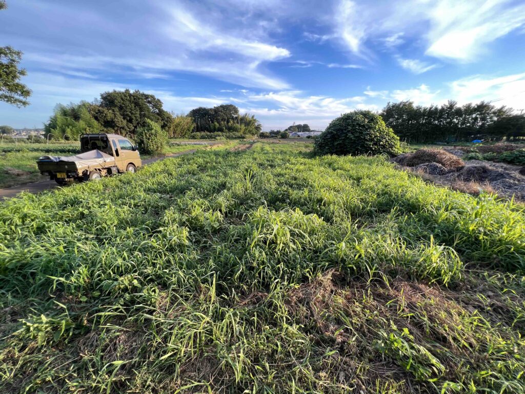 現在いっている「いかす」の教えではとにかく緑肥がよいと進められます。せっかくの教えなのでもう一つ借りている畑で教えどおりに実践しています。夏の栽培はあきらめ畑全面にソルゴーを撒きました。