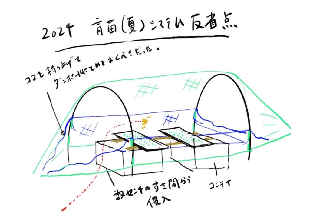 秋冬野菜の育苗はこの猛暑の中始まります。寒さが本格的になってしまうとキャベツや白菜は結球できません。10月、11月でどこまで成長できるかが勝負になります。逆算すると今の時期から育苗をしないと間に合いません。この暑さのなか育苗するにあたり最大の敵は虫です。キャベツや白菜のようなアブラナ科植物は虫たちの大好物。私達がキャラメルポップコーンの香りに引き寄せられるように虫たちが集まります。農薬は使えないので防虫ネットを使います。これもただ被せるだけではダメで完全封鎖しなくてはなりません。